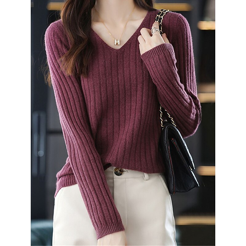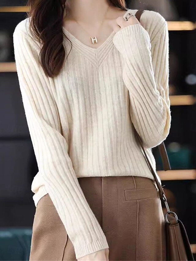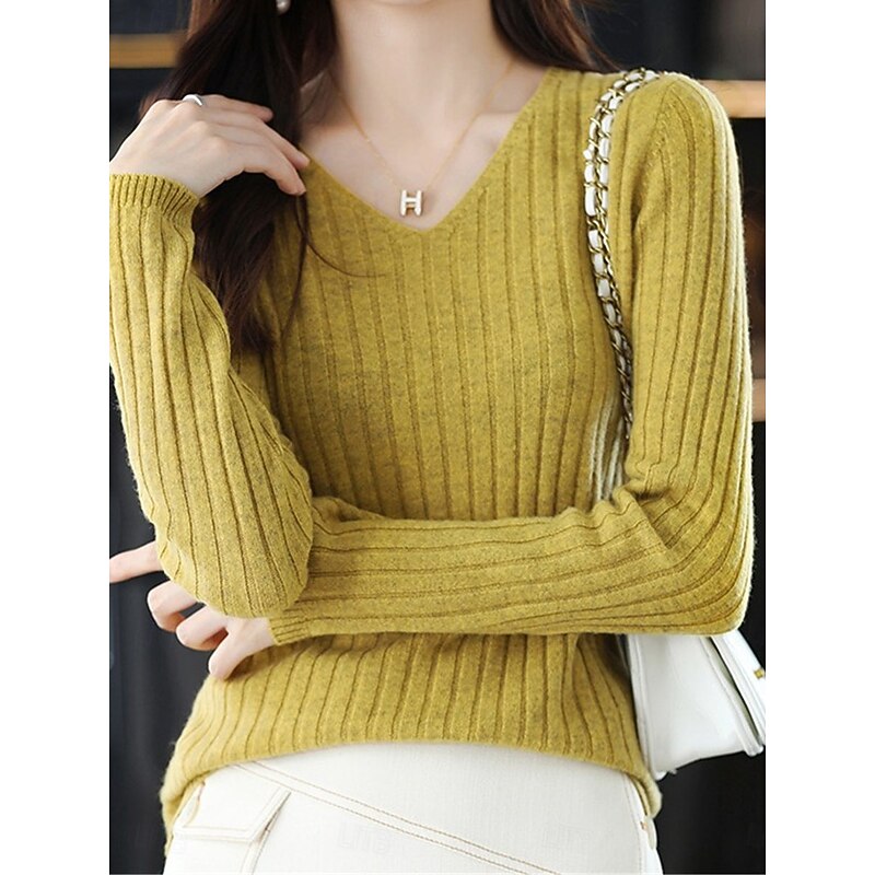 More information about Women's Sweater Pullover Sweater Jumper Casual Soft Pure Color Ribbed V Neck Knitted Long Sleeve Regular Tops Knit Outdoor Daily Weekend White Yellow Fall Winter