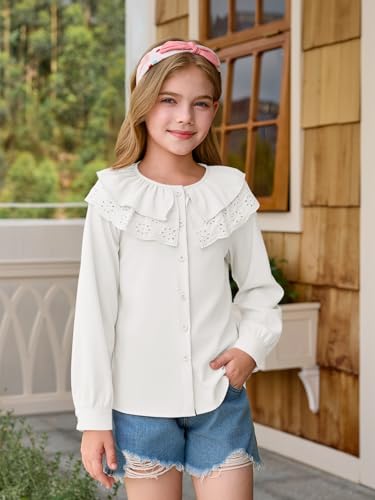 Girls Eyelet Ruffle Collar Blouse Kids Long Sleeve Button Down Shirt Cute Uniform Tops 5-14 Years 6
