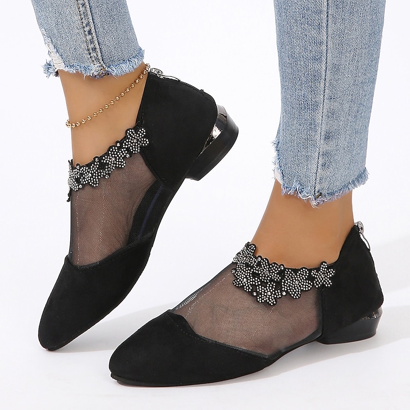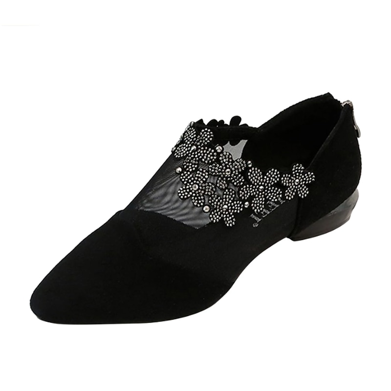 Highlights [Fabric] Expertly crafted from faux suede and mesh, these ankle boots offer a luxurious texture with a sophisticated finish. The faux suede provides a soft and elegant surface, while the sheer mesh panel adds a contemporary twist with intricate floral lace embellishments for a touch of delicate femininity. [Design Style] The boots feature a pointed-toe design that exudes elegance and class. The low, block heel offers both stability and comfort, making them suitable for prolonged wear. A convenient back zipper closure maintains a sleek silhouette while ensuring easy wearability. [Design Highlights] Highlighting a blend of minimalism and elegance, these boots showcase beautiful floral rhinestone embellishments on the mesh, enhancing their visual appeal. The understated embellishments provide a subtle shine, giving the boots an eye-catching, yet refined look. [Occasions] Perfect for formal events, office wear, or casual outings, these boots seamlessly transition between different settings. They are ideal for spring, summer, and fall occasions, adding a touch of sophistication and charm to any wardrobe. [Size Range] These boots are available in sizes ranging from 36 to 43, accommodating a wide range of foot sizes. The UK size equivalent is 14.5, and the EU size is 50, ensuring they cater to varied preferences and fits.