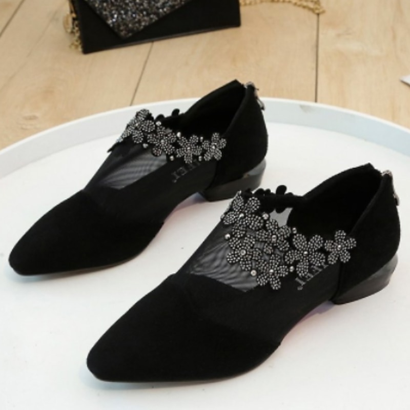 Women's Black Mesh Ankle Boots with Floral Rhinestone Embellishments - Elegant Low Heel Pointed Toe Shoes for Formal Events and Parties 14