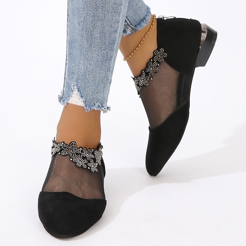 Women's Black Mesh Ankle Boots with Floral Rhinestone Embellishments - Elegant Low Heel Pointed Toe Shoes for Formal Events and Parties 1