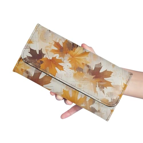HOT ! Brown Maple Leaves Women Wallet Slim Long Trifold Clutch Wallets, Modern Art Painting Leaf PU Leathers Checkbook Purse, Beige Credit Card Holder with Zipper Pocket