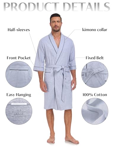 EA'S SECRET 100% Cotton Mens Lightweight Robe Summer Short Sleeve Bathrobe Soft Knee Length Robe with Pockets (Grey, L) 5