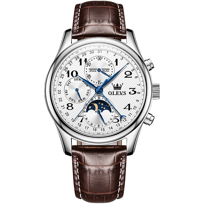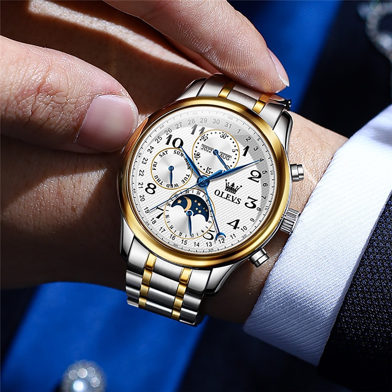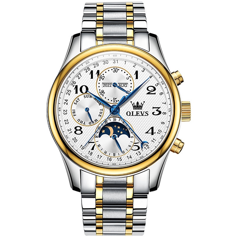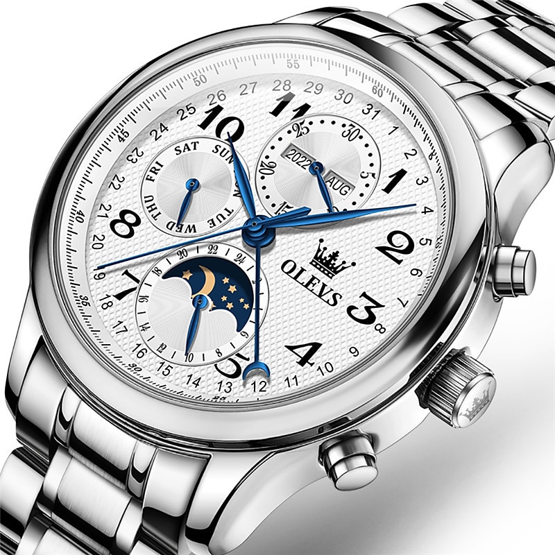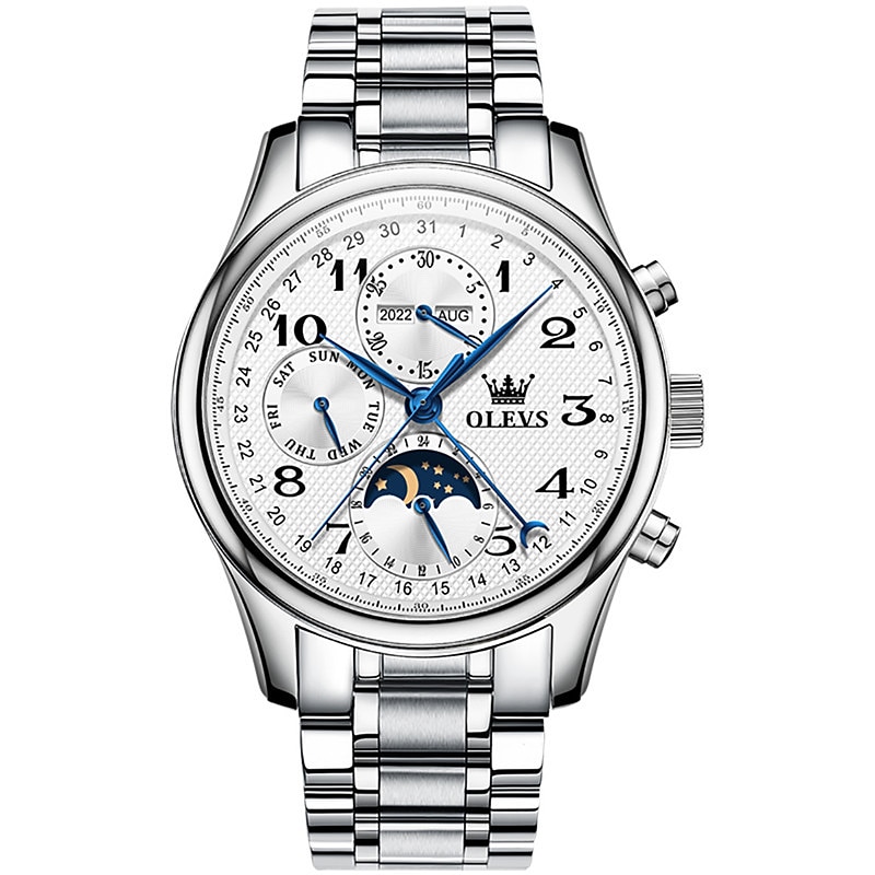 OLEVS Men Mechanical Watch Calendar Luxury Waterproof Wristwatch Automatic Self-winding Moon phase Dual Display Calendar Stainless Steel Strap Watch 10