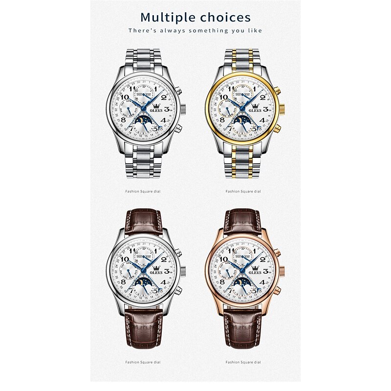 OLEVS Men Mechanical Watch Calendar Luxury Waterproof Wristwatch Automatic Self-winding Moon phase Dual Display Calendar Stainless Steel Strap Watch 11