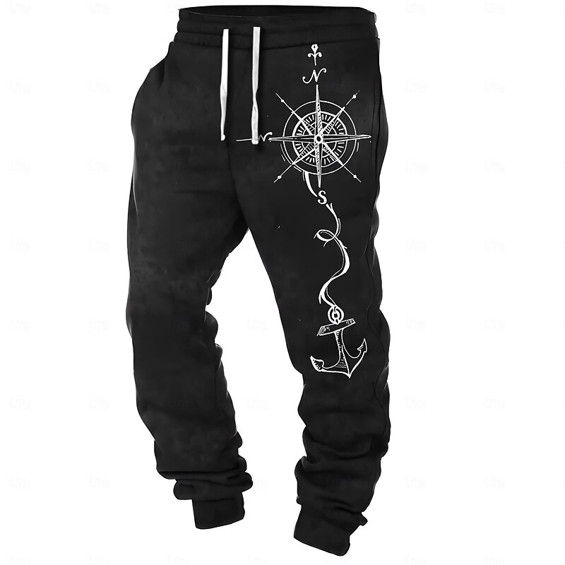 : The standout feature of these joggers is the nautical-themed 3D print, showcasing a detailed compass and anchor graphic that adds a touch of adventurous style. With practical pockets, these pants blend functionality with fashion.