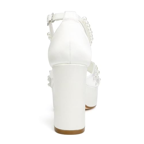 Women's Platform Heels Pearl Wedding Shoes for Bride Open Toe Chunky Heel Bridal Sandals 4