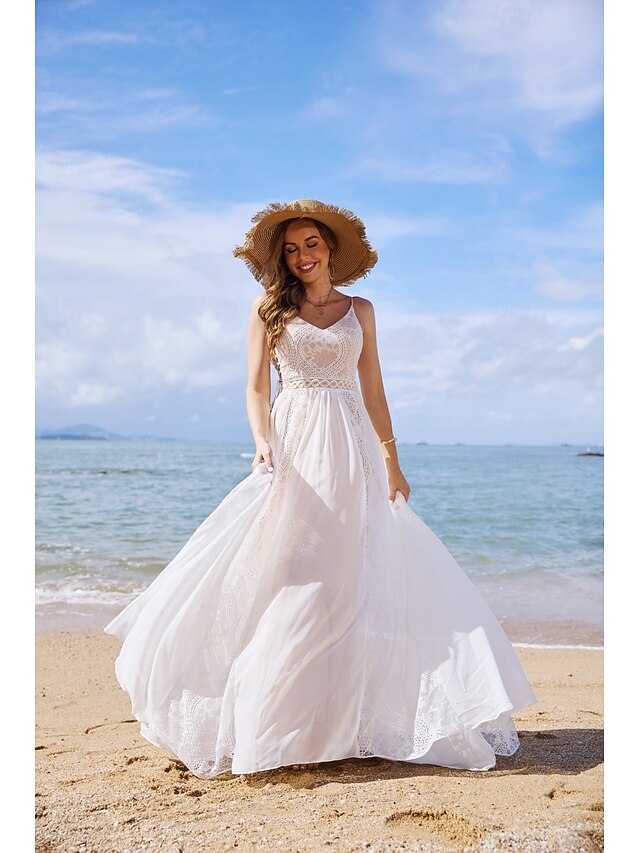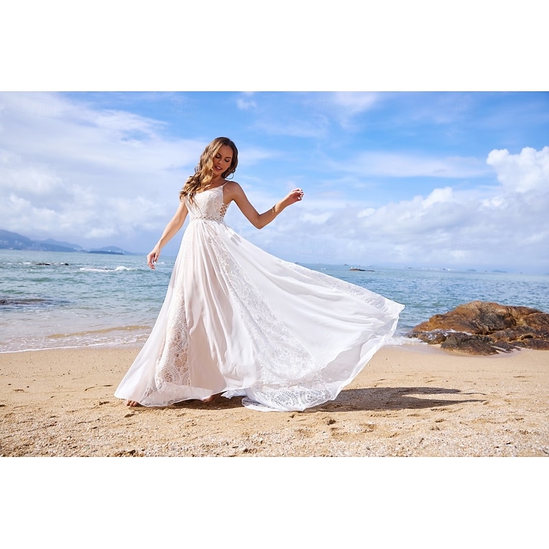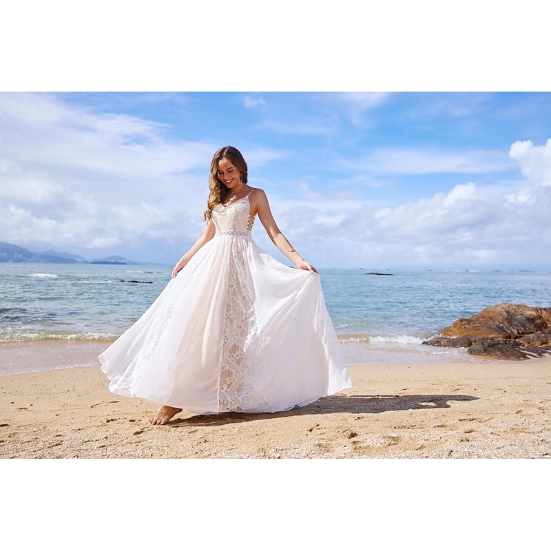 More information about Beach Open Back Boho Wedding Dresses A-Line V Neck Spaghetti Strap Sleeveless Sweep / Brush Train Chiffon Bridal Gowns With Tassel