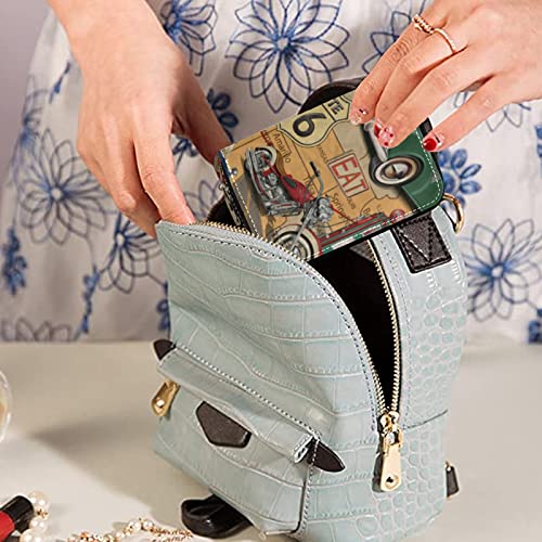 Vintage Route 66 Poster Blue, Yellow, Green Cars Motorcycle USA Flag Grey Credit Card Coin wallet, RFID Blocking Compact Women Leather Card Holder, Key Change Organizer, Zipper Purse Clutch Pouch 7