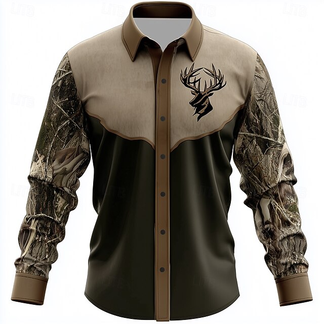 Men's Reindeer Camouflage Color-blocking Shirt Button Up Shirt Long Sleeve Vintage Retro Outdoor Camping & Hiking Hunting Spring Fall Turndown 3D Print Linen Like Shirt Camouflage khaki Khaki 3