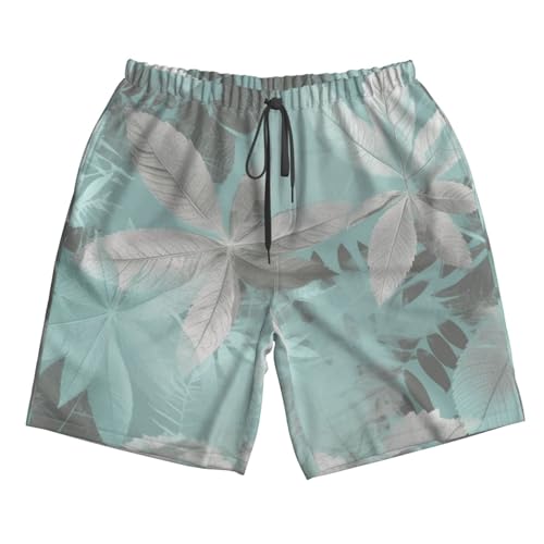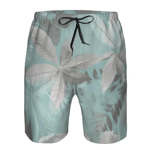 HOT ! Mint Gray Leaves Men's Swim Trunks Quick Dry Board Shorts with Pockets Casual Drawstring Beach Shorts