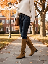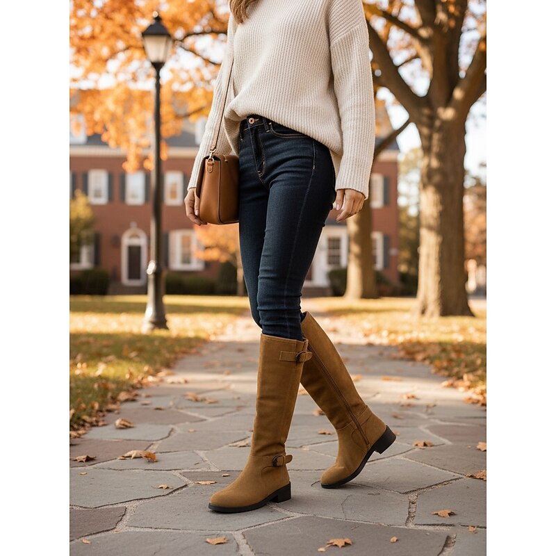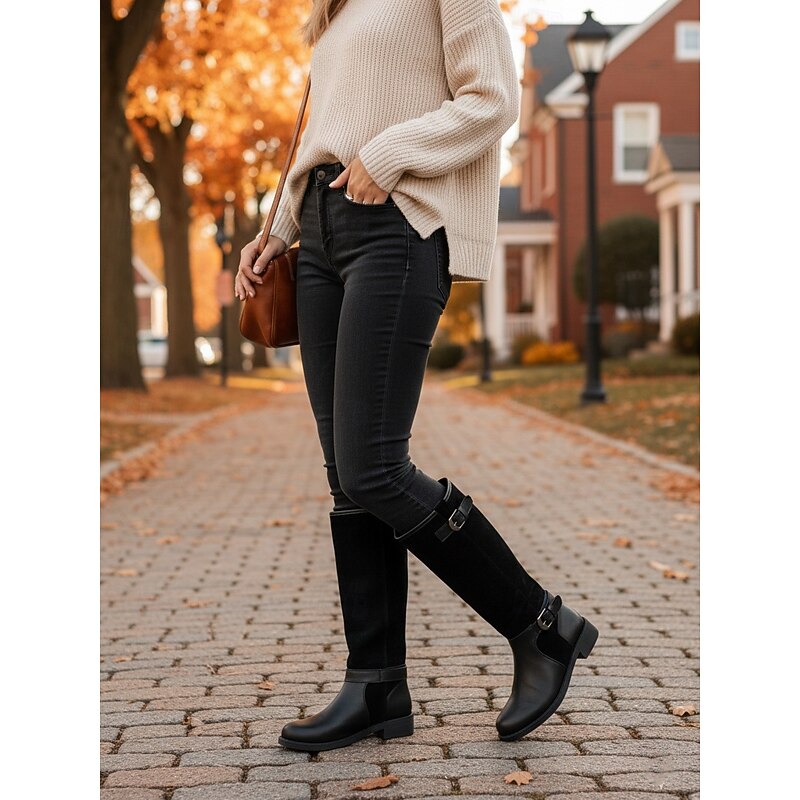 Women's Adjustable Shaft Knee High Boots - Suede and Faux Leather Combination with Buckle Detail, Fashionable Riding Style Footwear for Urban Casual Outfits and Everyday Wear 14