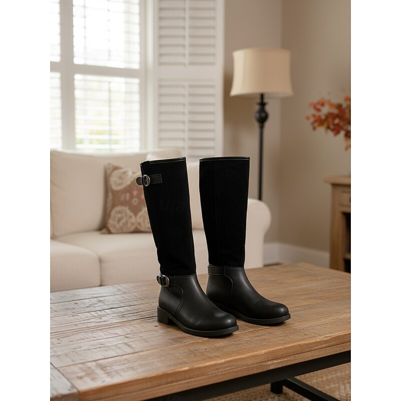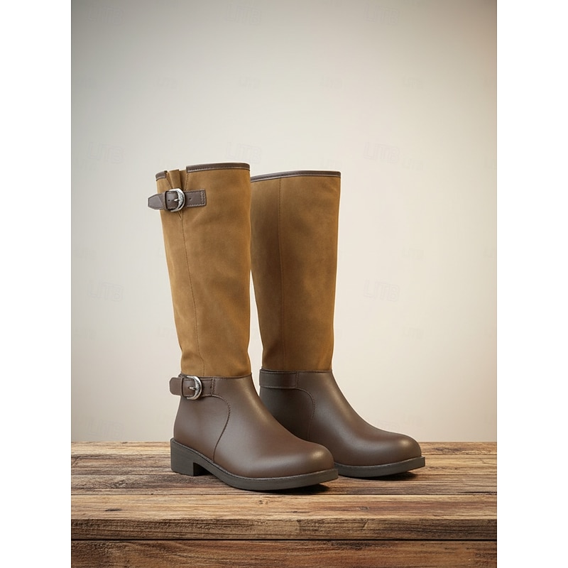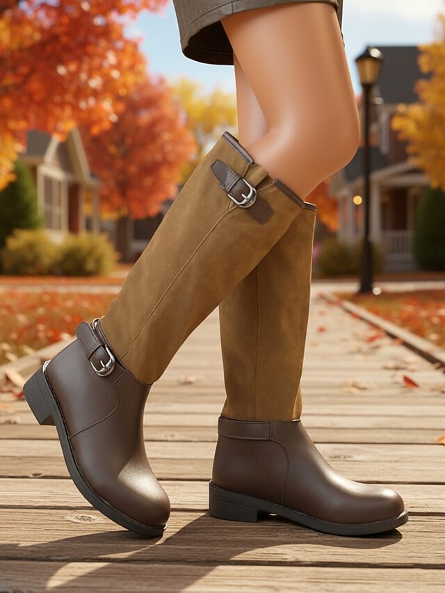 Women's Adjustable Shaft Knee High Boots - Suede and Faux Leather Combination with Buckle Detail, Fashionable Riding Style Footwear for Urban Casual Outfits and Everyday Wear 1