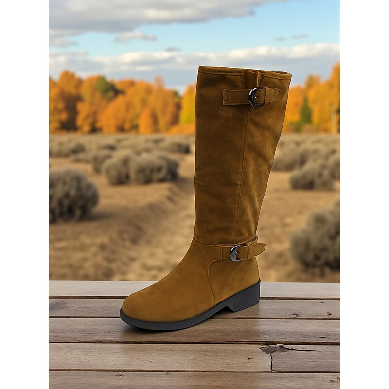 Women's Adjustable Shaft Knee High Boots - Suede and Faux Leather Combination with Buckle Detail, Fashionable Riding Style Footwear for Urban Casual Outfits and Everyday Wear 7