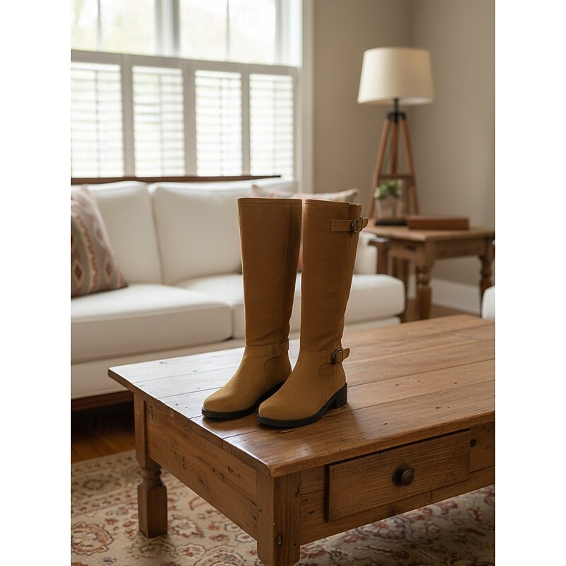 Women's Adjustable Shaft Knee High Boots - Suede and Faux Leather Combination with Buckle Detail, Fashionable Riding Style Footwear for Urban Casual Outfits and Everyday Wear 4