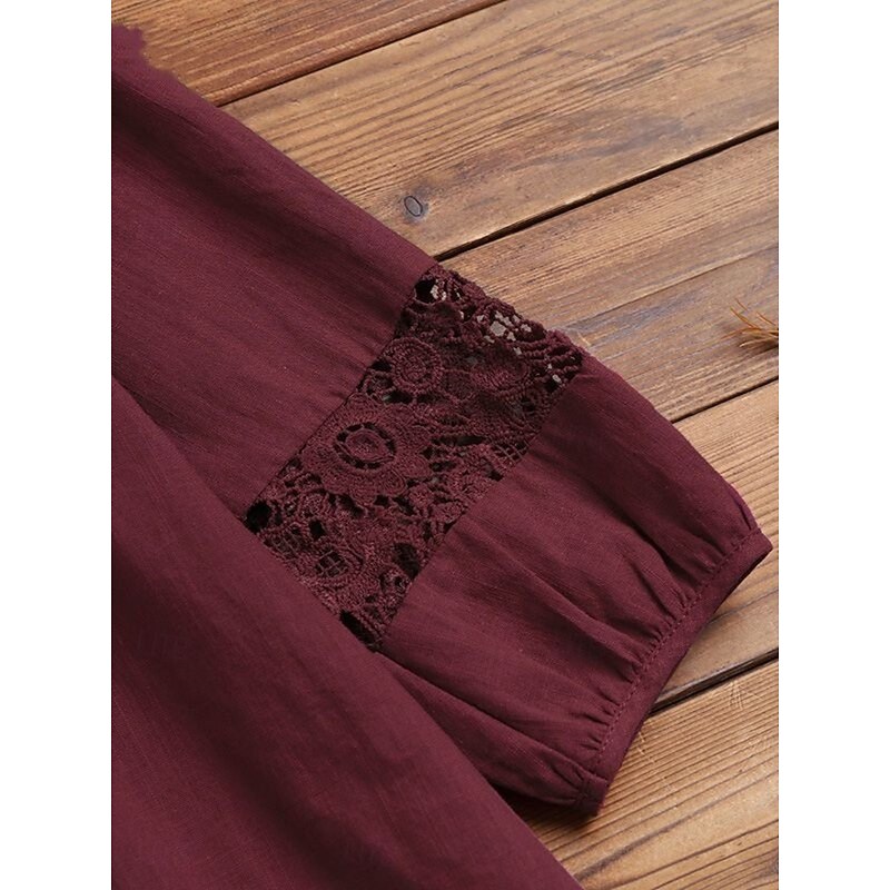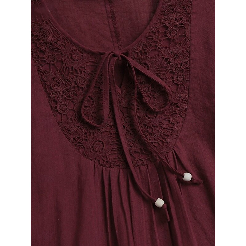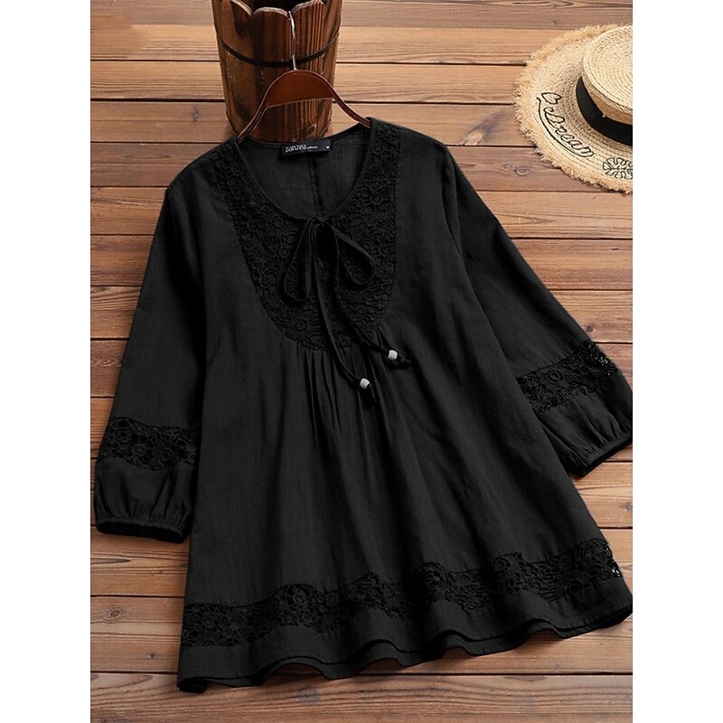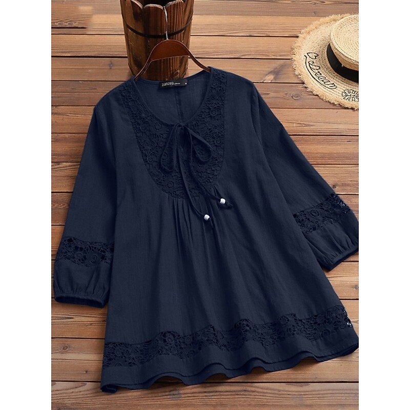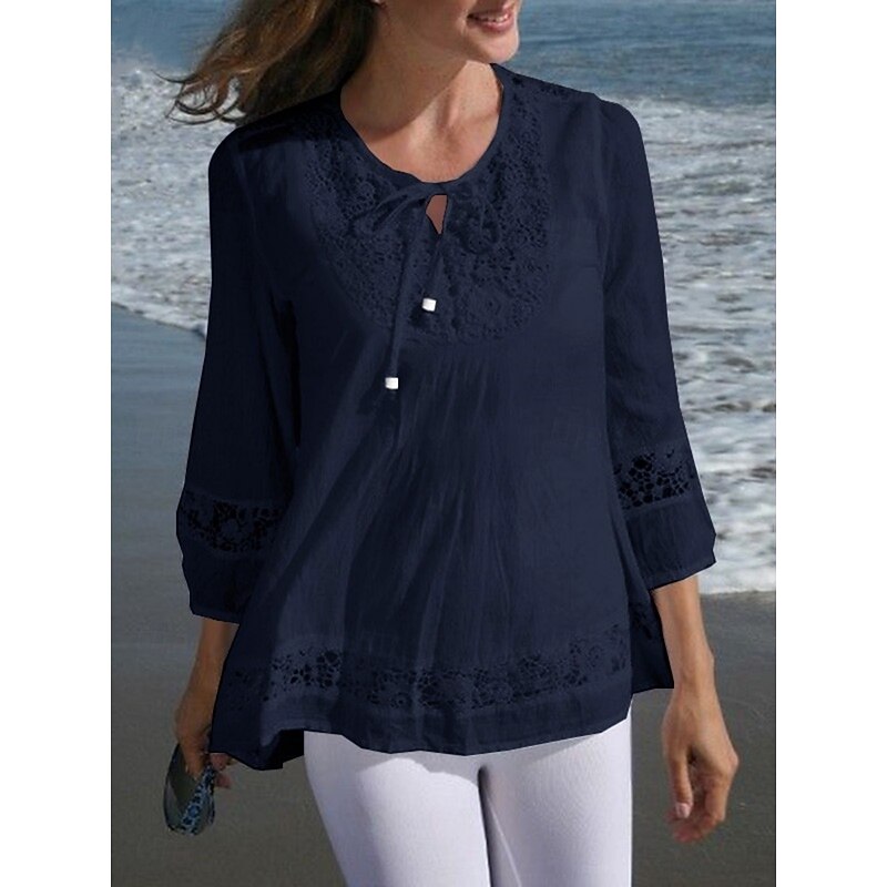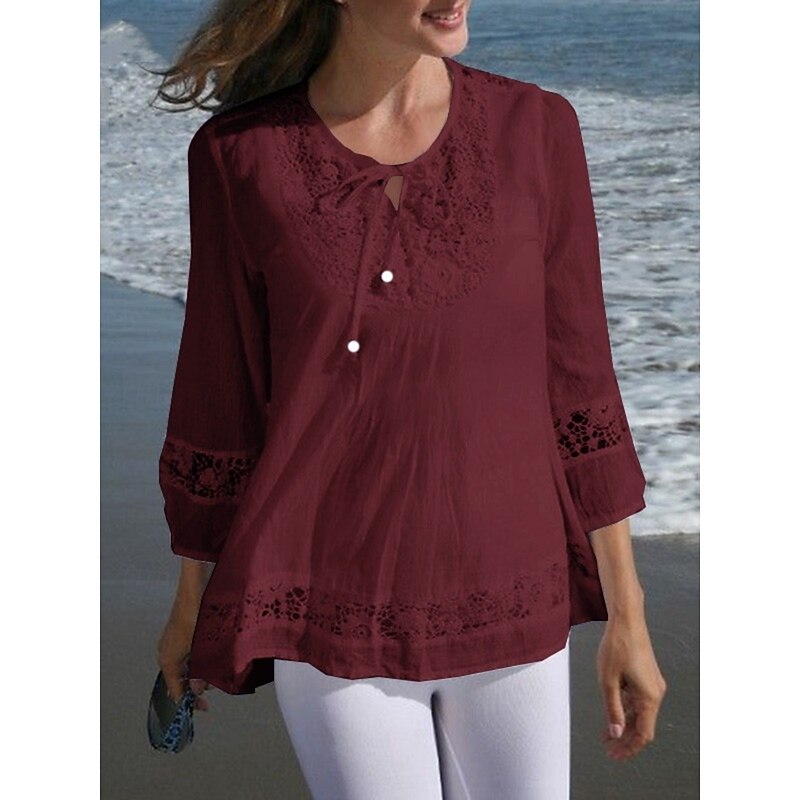 More information about Women's Cotton Linen Shirts Solid Color Stylish Casual 3/4 Length Sleeve V Neck Regular Tops Daily Lace Patchwork Black White Wine Navy Blue Summer Spring