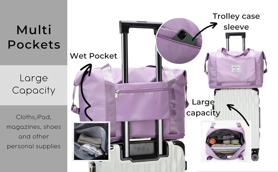 Large Capacity Folding Travel Bag, Lightweight Waterproof Luggage Bag, Expandable Travel Duffel Bag, Dry Wet Separated Gym Tote Bag (Light purple) 5