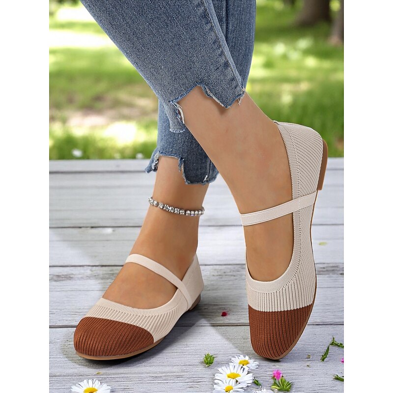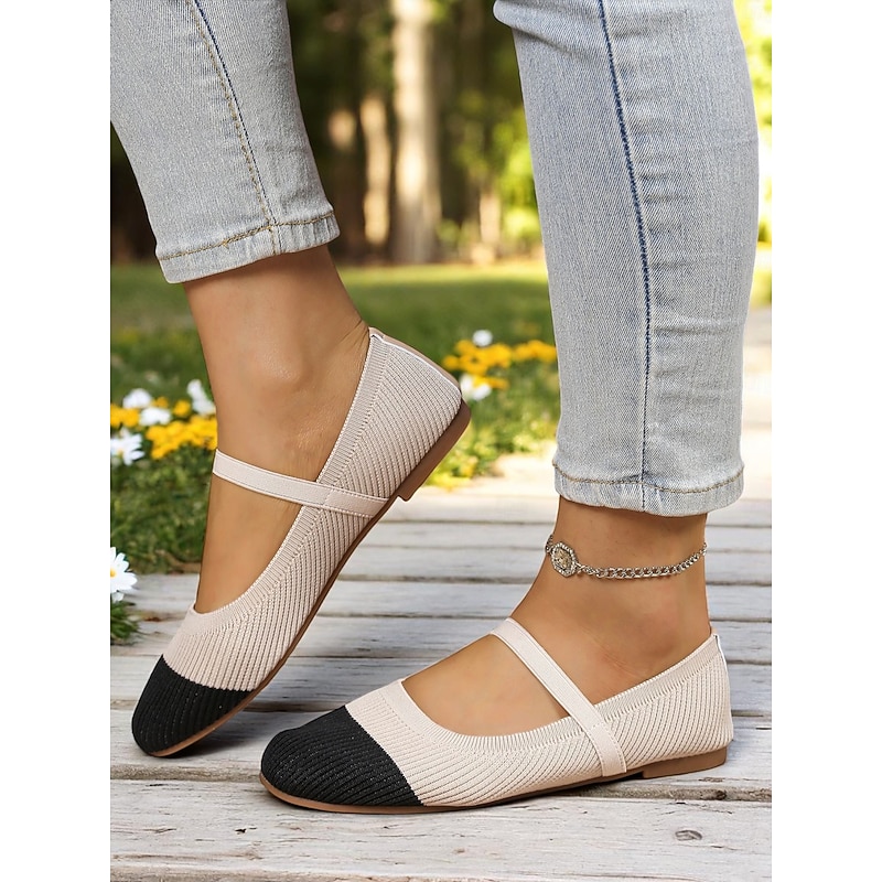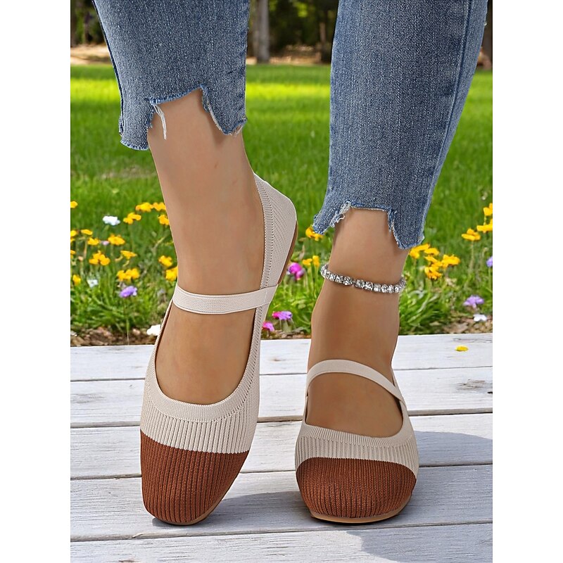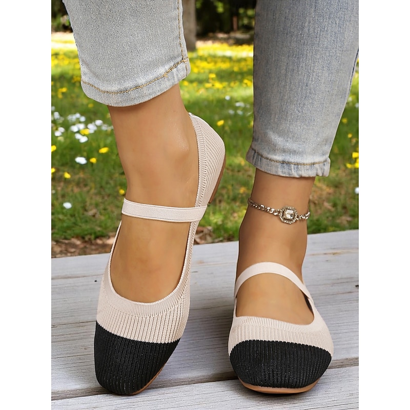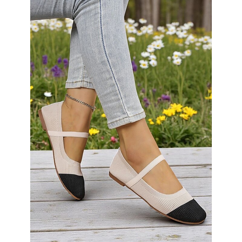 HOT ! Women's Two-Tone Knit Ballet Flats with Strap – Breathable Casual Mary Jane Shoes for Daily Wear, Walking and Spring Outings