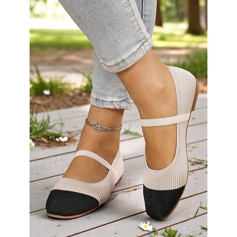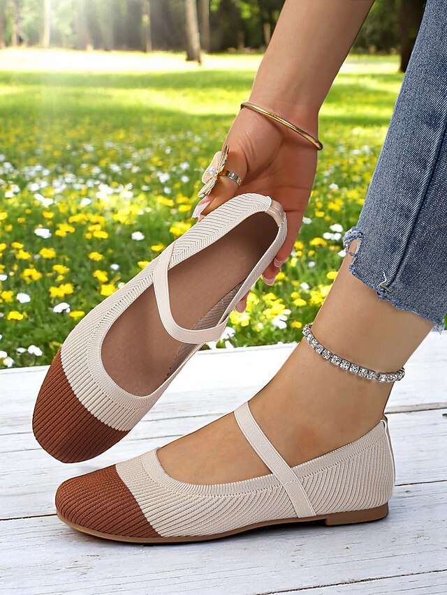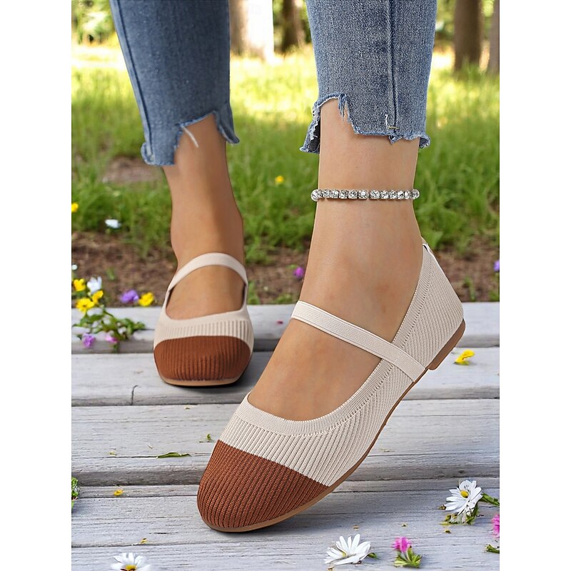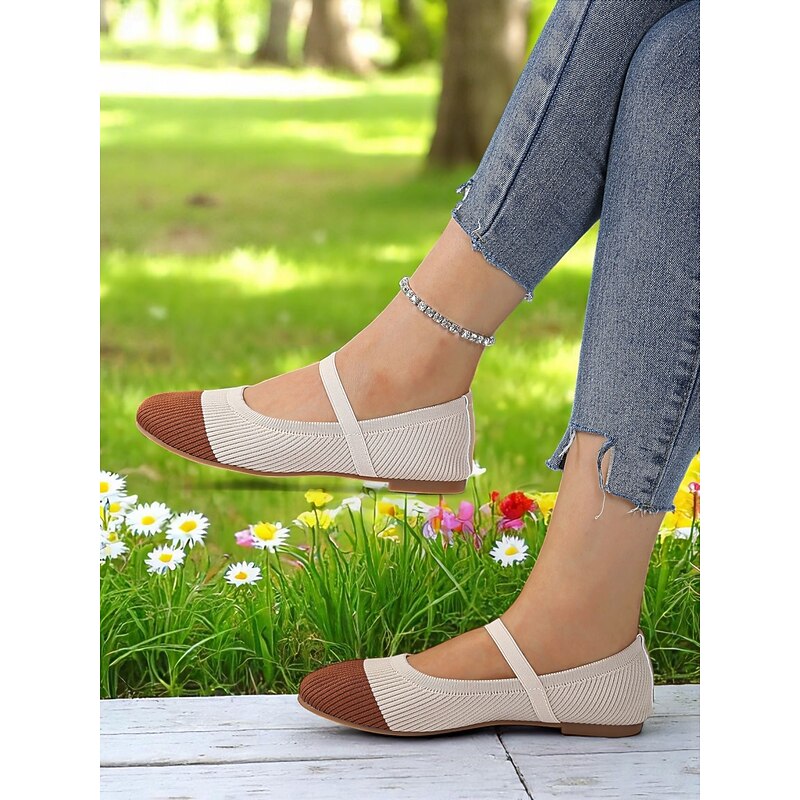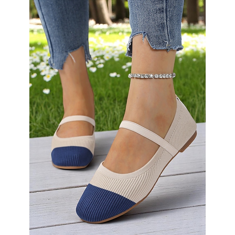 HOT ! Women's Two-Tone Knit Ballet Flats with Strap – Breathable Casual Mary Jane Shoes for Daily Wear, Walking and Spring Outings