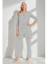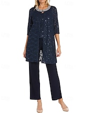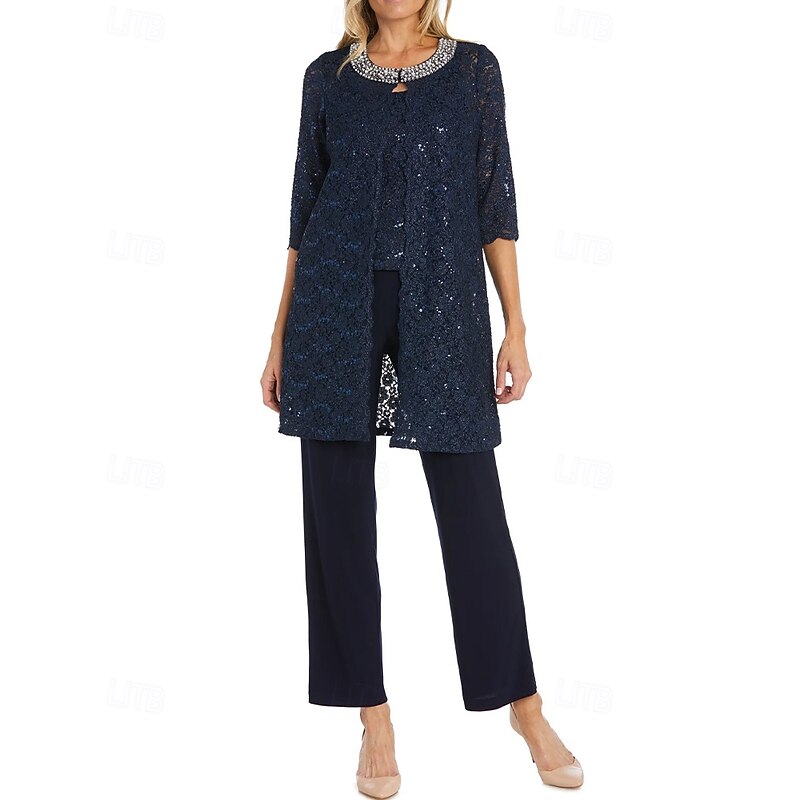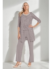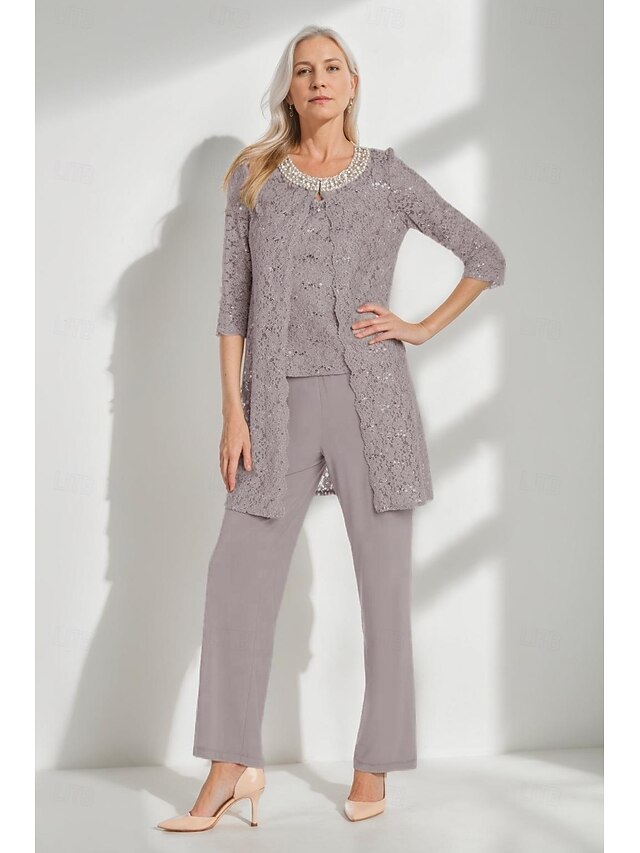 More information about Glitter Lace Pantsuit 3 Piece Mother of the Bride Pantsuit Simple Minimalist Sparkle & Shine Crew Neck Ankle Length Lace Sleeveless Half Sleeve with Pearls Beading