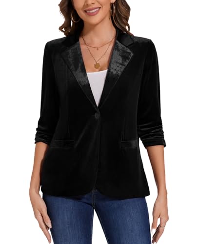 • 【Features】 Women's velvet blazer for business casual. Slim fit, Half lined, 3/4 Ruched Sleeve, Notched Lapel, One-button closure, Back vent, 2-side single welted pockets (pockets are stitched with thread which need to cut off). This womens stretchy blazer is designed to keep you stylish and comfortable in any setting.