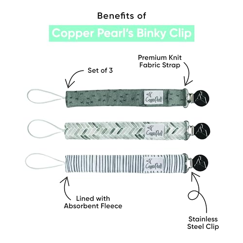 • BINKY CLIPS – Our unique binky clip features a premium knit strap lined with absorbent fleece to help soak up drool and a stainless steel clip. Offering a chic way to keep baby's pacifier close at hand with no more floor drops or pacifier pick-ups'