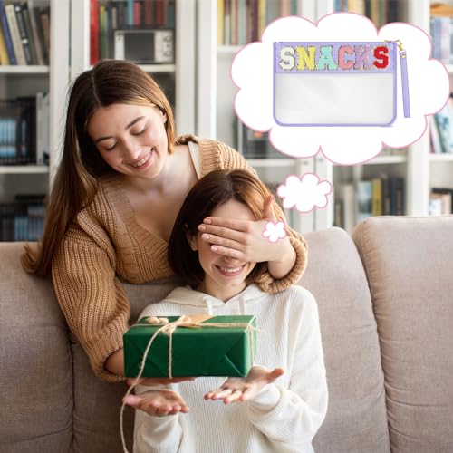 Morcheiong Chenille Letter Bag Cute Clear Zipper Stuff Pouch Portable Multi-purpose PVC and Nylon Makeup Bag with Handle for Travel Gym Beach(Purple Snacks) 4
