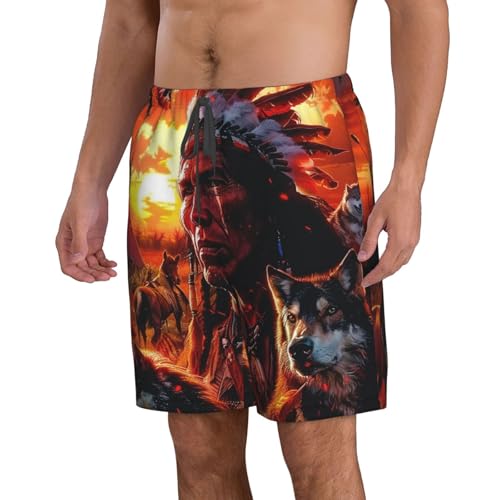 HOT ! Native American Chief Horse Wolve and Eagle Orange Men's Quick Dry Swim Shorts, Mesh Lined Beach Trunks with Pockets
