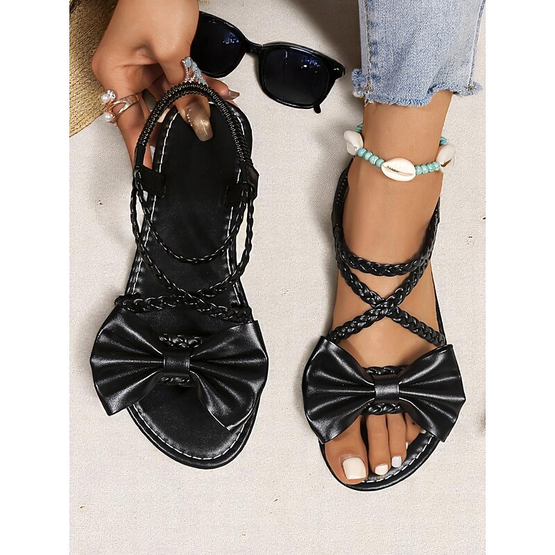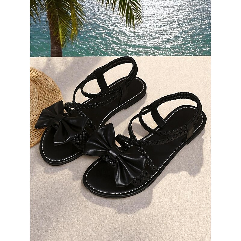 HOT ! Women's Brown Braided Bow Flat Sandals – Boho Chic Open-Toe Slip-On Summer Shoes for Beach, Vacation & Casual Outings