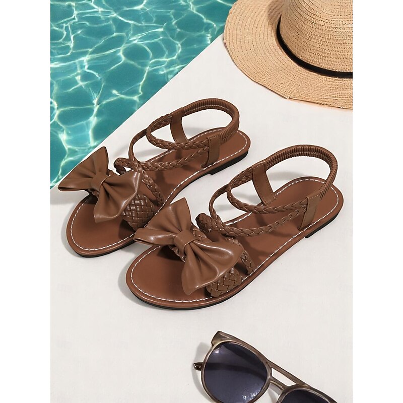 Women's Brown Braided Bow Flat Sandals – Boho Chic Open-Toe Slip-On Summer Shoes for Beach, Vacation & Casual Outings 12