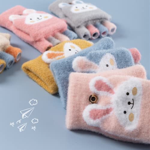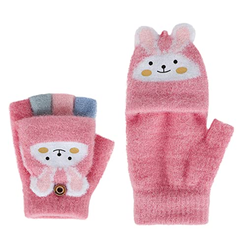 Kids Convertible Fingerless Gloves Cat Bunny Knit Flap Cover Mittens Half Finger Stretchy Mitten Glove for Girls Boys 6-12Y 5