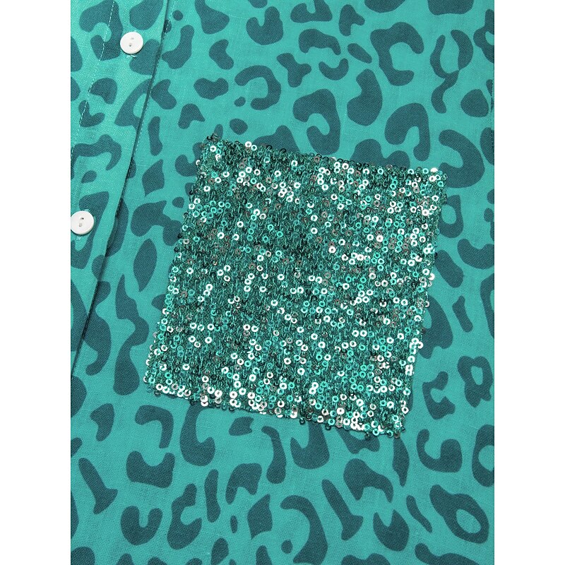 Women's Shirt Dress Print Dress Maxi Dress Blue Green Leopard prints Roll up Sleeves Sequin Summer Shirt Collar Leopard Print S M L 5
