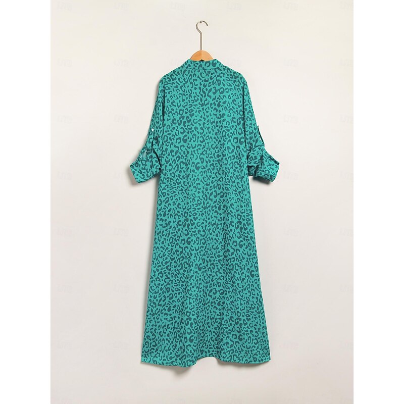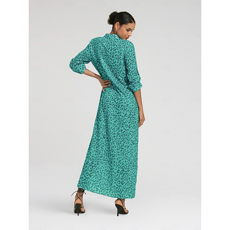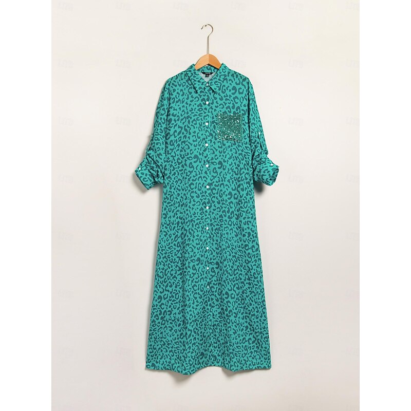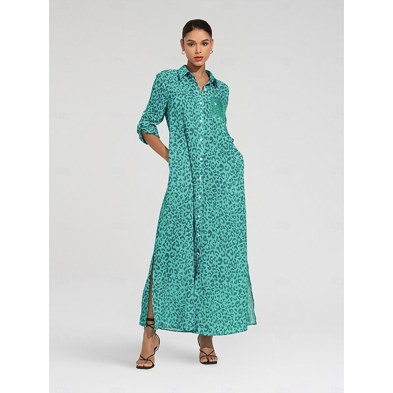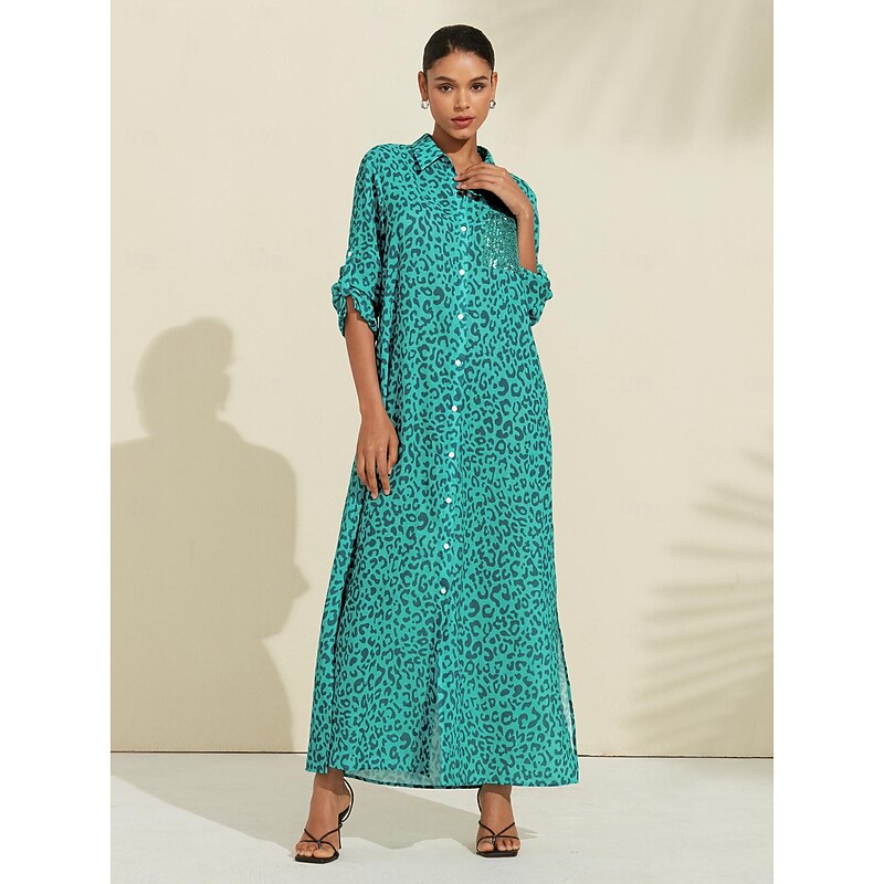 More information about Women's Shirt Dress Print Dress Maxi Dress Blue Green Leopard prints Roll up Sleeves Sequin Summer Shirt Collar Leopard Print S M L