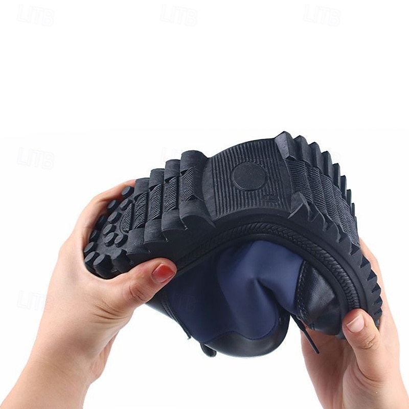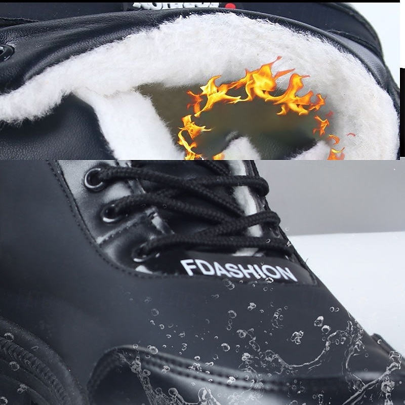 Highlights [Fabric] : Crafted from premium PU leather combined with sturdy fabric, the Men's Winter Waterproof Lace-Up Ankle Boots offer a sophisticated and modern aesthetic. The exterior's striking blue hue is complemented by black accents and distinctive red stitching, enhancing its stylish appeal. [Fit and Style] : Designed with a rounded toe and a secure lace-up closure, these boots ensure a comfortable, snug fit. The fleece lining maximizes warmth and coziness, providing insulation against harsh winter conditions. [Design Highlights] : Featuring a plush faux fur lining and a robust rubber outsole, these boots are tailored for optimal grip and slip resistance on icy or wet surfaces. The "Keep Warm" emblem emphasizes the boots' practical function, merging style with essential winter features. [Occasions] : Ideal for a variety of winter activities, these boots seamlessly blend fashion with functionality, making them suitable for both casual outings and outdoor adventures during cold weather. [Size Range] : Available in a range of sizes, including US7 through US10, accommodating various foot sizes to ensure a perfect fit for everyone looking to tackle winter in style.