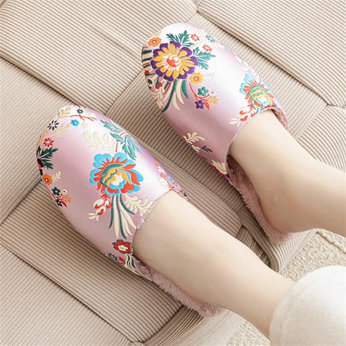 Chinese Slippers for Women Embroidered Flower Upper Silk and Fuzzy Plush Lining Warm Cozy Non-Slip Flat Shoes Indoor 7