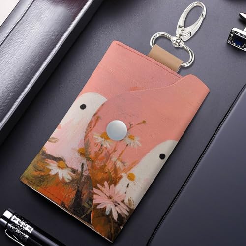 Three White Ghosts in The Field with Daisies Key Holder Bag PU Leather ID Card Holder Keychains Case Cover for Men Women 7