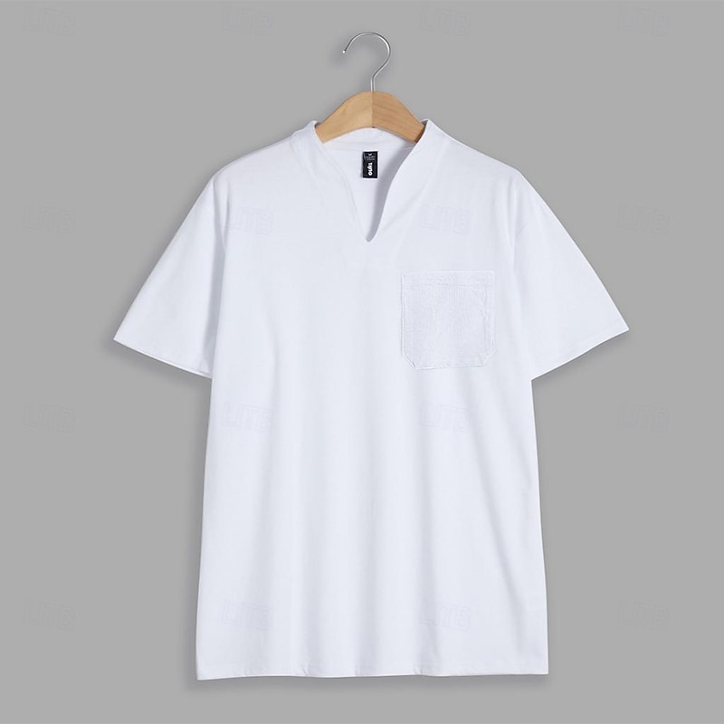 Highlights [Fabric] : Crafted from high-quality polyester, this men's T-shirt ensures a soft, lightweight, and breathable experience perfect for summer days. Its micro-elastic quality provides both comfort and a stylish fit. [Cut] : The tailored fit offers a flattering look that complements the physique, suitable for both casual and semi-formal settings. This T-shirt embodies versatility through its classic cut, allowing for an easy pairing with various types of trousers. [Design Highlights] : Featuring a modern V-neckline, this T-shirt incorporates a single front pocket for added casual charm. Its plain pattern emphasizes simplicity while maintaining a chic aesthetic that can effortlessly elevate any outfit. [Occasions] : Ideal for vacations, casual outings, and daily wear, this top is your go-to choice for a wide range of events. Whether you're going out for a leisurely day or enjoying a relaxed evening, its design ensures both comfort and style. [Size Range] : Available in sizes S to XXXL, this T-shirt caters to a wide range of body types, accommodating various style preferences. Available in a range of colors including white, black, navy blue, yellow, blue, and light gray, this piece makes a versatile addition to any wardrobe.