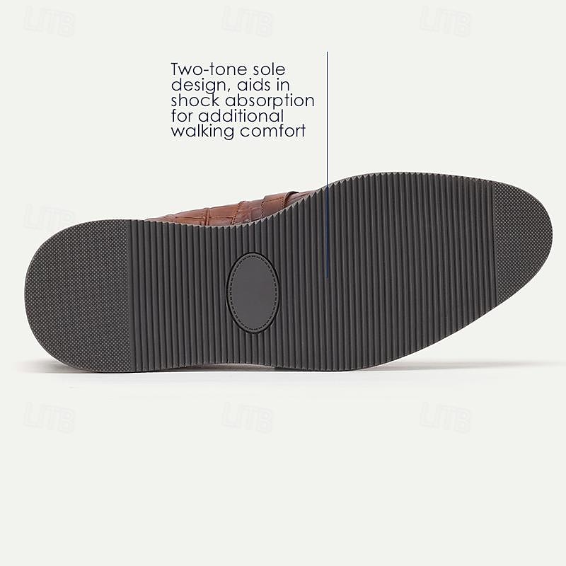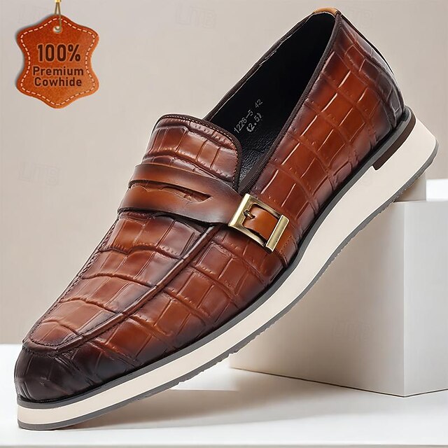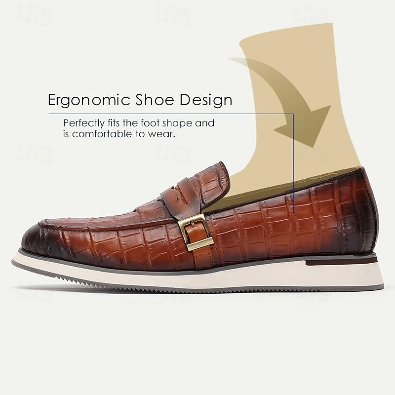Highlights [Fabric] : Crafted from premium Italian full-grain cowhide leather, these men's loafers showcase a luxurious crocodile pattern texture that highlights sophistication and high-quality craftsmanship. The leather lining further ensures comfort and durability, making them a staple in any wardrobe. [Fit] : These loafers feature a classic slip-on design with a comfortable round toe shape, providing a timeless and accommodating fit. The cushioned insole ensures prolonged comfort, while the EVA outsole adds a modern touch by offering slip resistance and durability. [Design Highlights] : The sleek, classic design is enhanced by a chic strap adorned with a metallic buckle, adding a touch of elegance and modernity. The combination of the rich brown and black tones exudes sophistication, suitable for the contemporary gentleman seeking elegance and comfort. [Occasions] : Perfect for both formal and casual settings, these loafers are versatile enough for a day at the office, a formal dinner, or a weekend gathering. Their refined style makes them an excellent choice for those who appreciate both functionality and fashion. [Size Range] : Available in a wide range of sizes from US6 to US13 (EU39 to EU46, UK5 to UK12), ensuring a suitable fit for various preferences and providing comfort and style for every occasion.