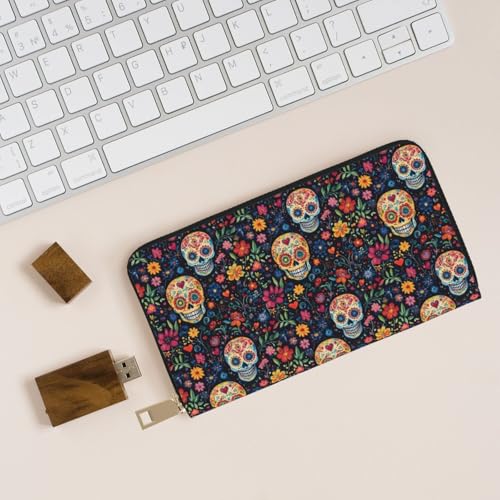 HOT ! Floral Skull Print Wallet Women Men, Long PU Leather Wallets for Women, Cute Womens Travel Wallet Purse Pouch with Zipper Pocket