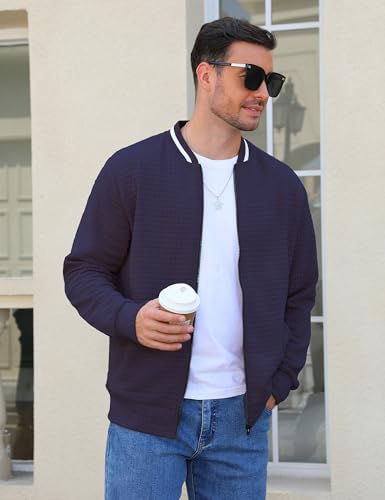 • 【STYLISH DESIGN】: Mens Casual Lightweight Bomber Jackets designed with a full zip, ribbed hem and cuffs, left arm with decorative zipper and 2 side pockets on the front. Lightweight Varsity Jackets featured with 3D waffle pattern quilted design, more stylish and stereoscopic.