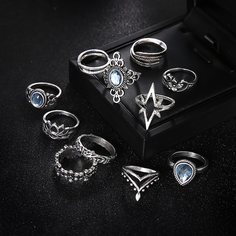 Highlights [Fabric] Crafted from a high-quality blend of alloy and acrylic, these rings offer durability and resistance to tarnishing, ensuring they remain a staple in your collection for seasons to come. [Style] This collection of 11 bohemian-style rings is perfect for creating a stacked look, featuring a variety of intricate and unique designs, with each piece varying in shape and size to allow for versatile styling across multiple fingers. [Design Highlights] Standout features include a centerpiece ring with floral engravings around a large oval stone resembling moonstone, a minimalist chevron ring for modern elegance, and a lotus ring symbolizing purity. Additional designs include a feather ring with a natural aesthetic, a bold star ring with an open design for a contemporary edge, and a teardrop gem ring to add sparkle. [Occasions] These rings are ideal for holidays, birthdays, gifts, sports events, and festivals. Whether dressing for a special occasion or adding a touch of artistry to daily wear, these rings elevate any ensemble with a touch of bohemian charm. [Size Suggestions] Designed to be one size, these rings provide flexibility in fit, making them suitable for most women's finger sizes and perfect for mixing, matching, and layering to display personal style.