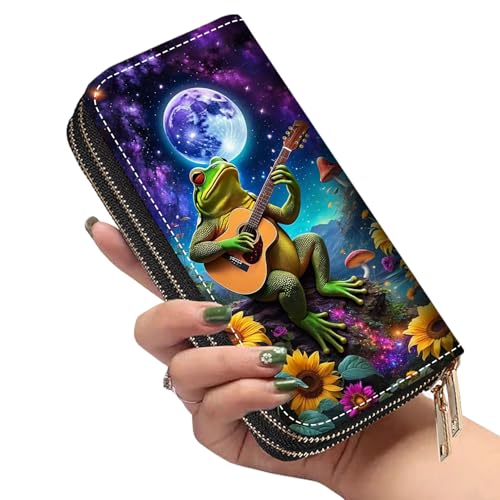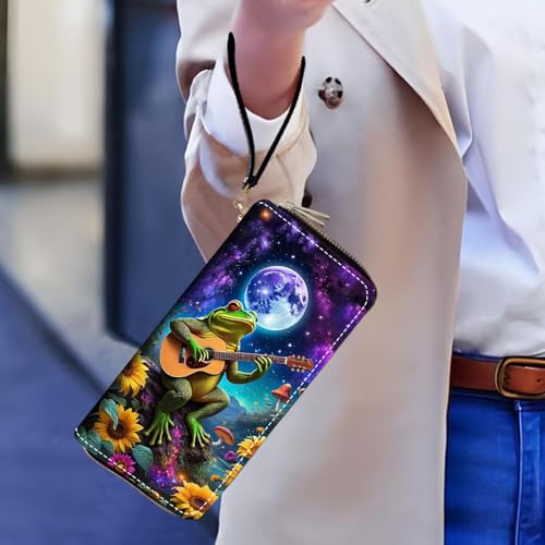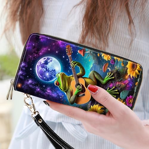 HOT ! Women's Large Capacity Wallet PU Leather Double Zipper Clutch Purse Multifunctional Wallet with Removable Wristlet Strap for Smart Phone/Coin/Card/Cash, Funny Frog Playing Guitar