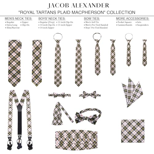 • Part of the Jacob Alexander Royal Tartans Plaid accessories collection - men's and boys' neck ties, bow ties, cummerbunds, suspenders, and pocket squares, available in several colors.