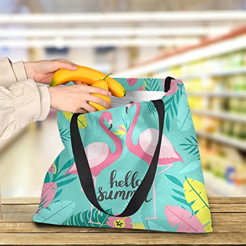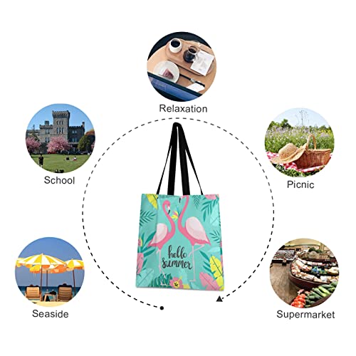 Turquoise Tropical Palm Leaves Two Pink Flamingos Hello Summer Women Large Casual Handbag Grocery Reusable Tote Bag Canvas Shoulder Bags for Shopping Travel Outdoors 7