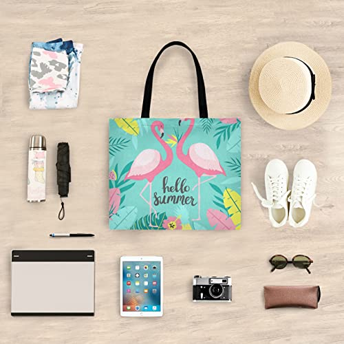 Turquoise Tropical Palm Leaves Two Pink Flamingos Hello Summer Women Large Casual Handbag Grocery Reusable Tote Bag Canvas Shoulder Bags for Shopping Travel Outdoors 6