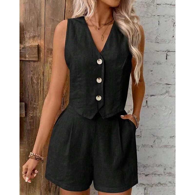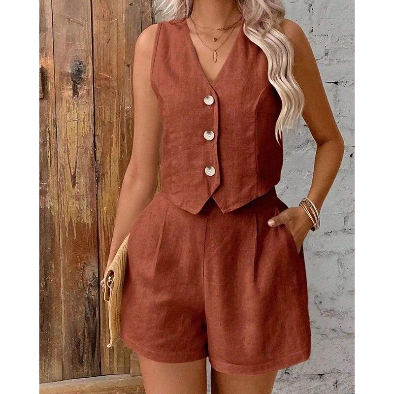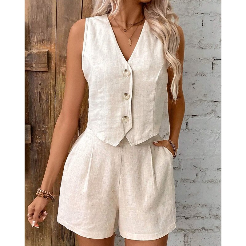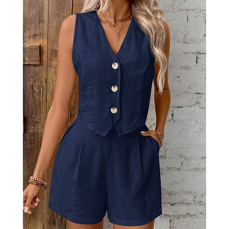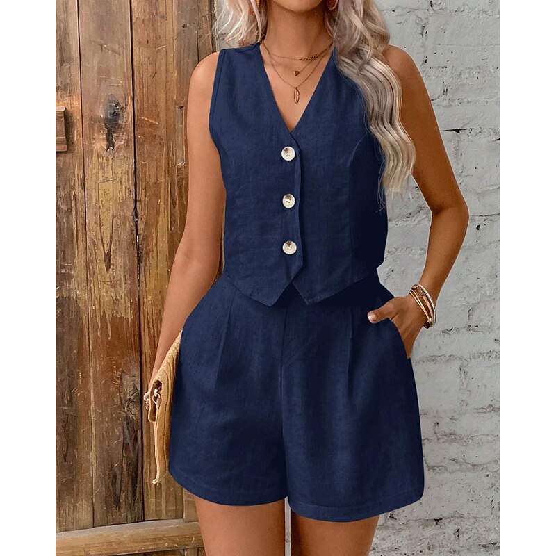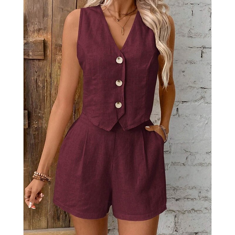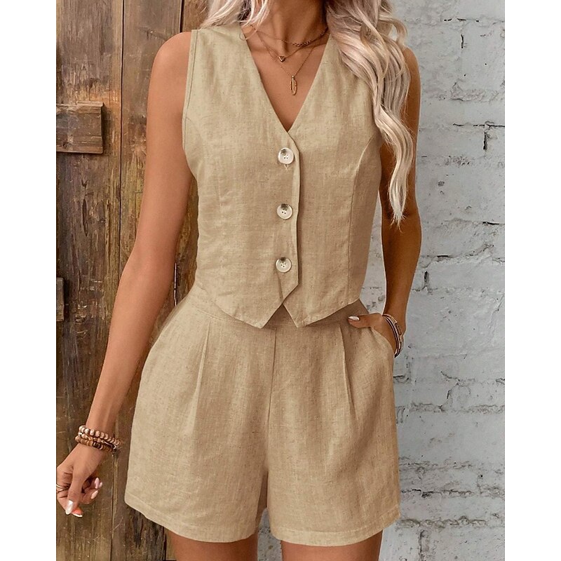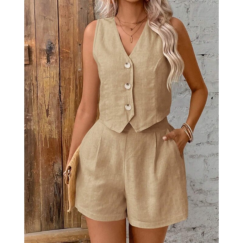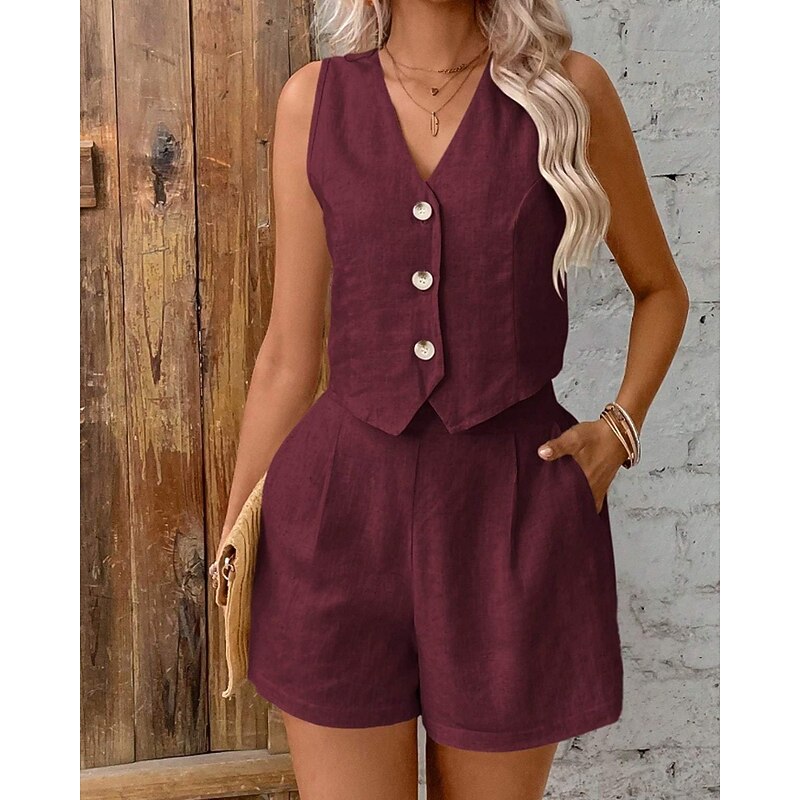 HOT ! Women's Active Blouse Vest Shorts Sets Sleeveless V Neck Solid Color Dubbele Rij Knopen Holiday Casual Daily Black Wine Army Green Summer Regular Fit