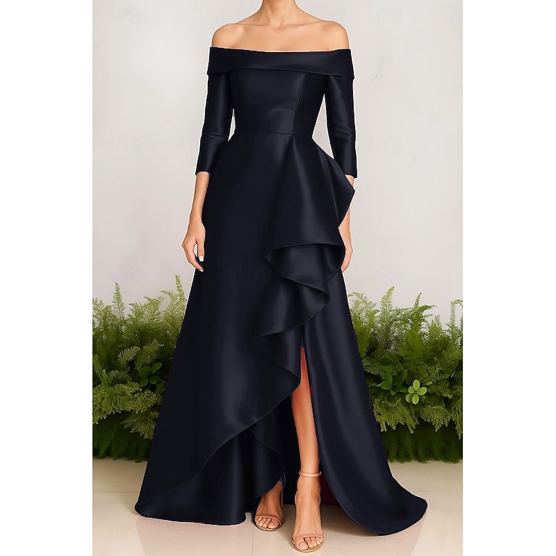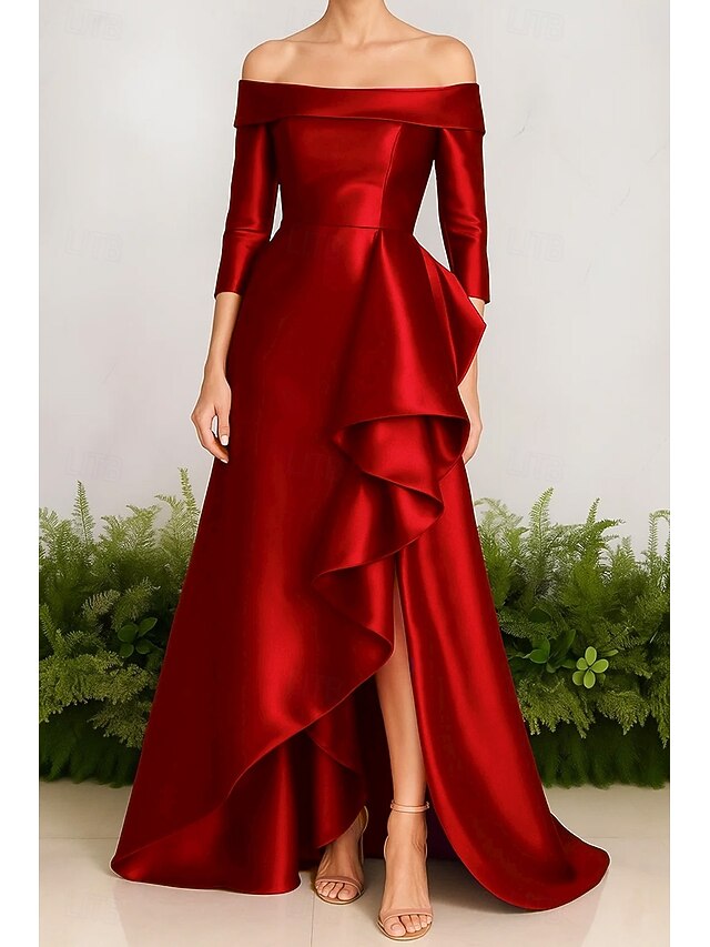 More information about A-Line Evening Gown Stretch Satin Ruffle Dress Elegant Dress Formal Wedding Sweep / Brush Train 3/4 Sleeve Off Shoulder with Slit 2025