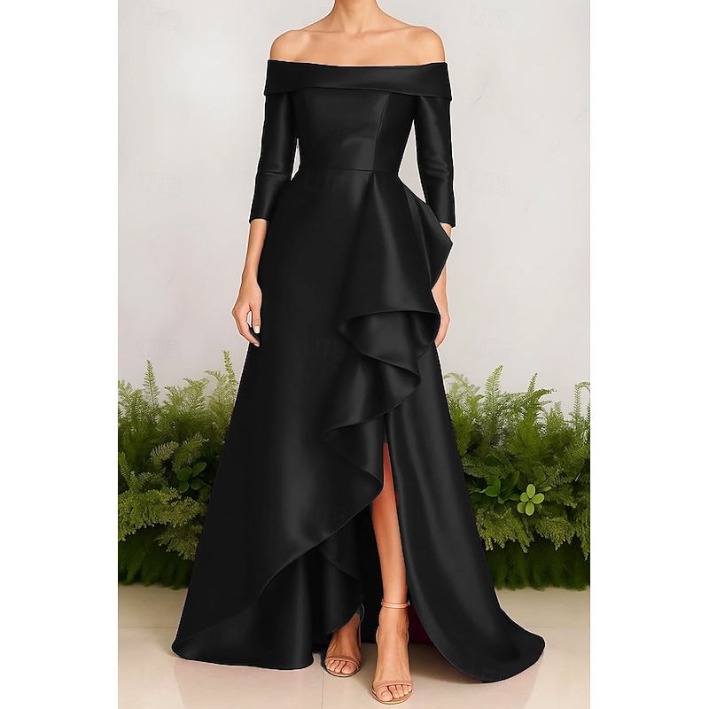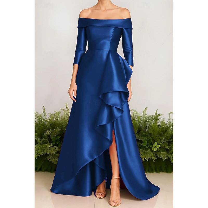 HOT ! A-Line Evening Gown Stretch Satin Ruffle Dress Elegant Dress Formal Wedding Sweep / Brush Train 3/4 Sleeve Off Shoulder with Slit 2025