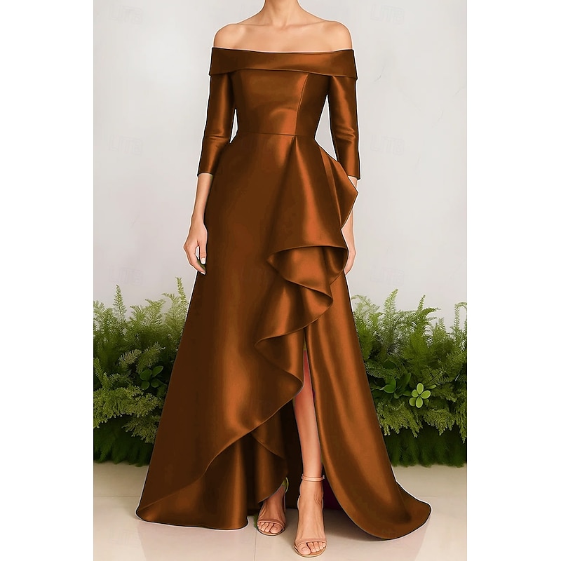A-Line Evening Gown Stretch Satin Ruffle Dress Elegant Dress Formal Wedding Sweep / Brush Train 3/4 Sleeve Off Shoulder with Slit 2025 12