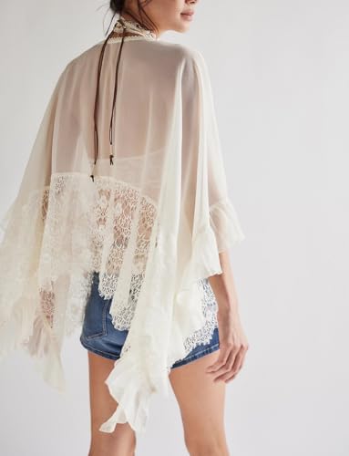 More information about Women Sheer Poncho Tops Oversized Batwing Sleeve Blouse Contrast Lace See Through Mesh Cover Up Ruffle Flowy Boho Shirt